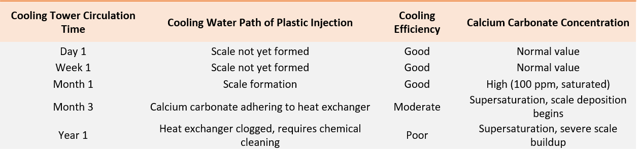 冷却水塔运作时,其实不断补进新的碳酸钙水,最后使冷却系统中的碳酸钙离子浓度上升,当带有高浓度碳酸钙之冷却水进入机械设备的热交换器时,就会遇热然后快速产生水垢,并附着在热交换器或水管上,最后造成换热效率降低并使机台过热停机。